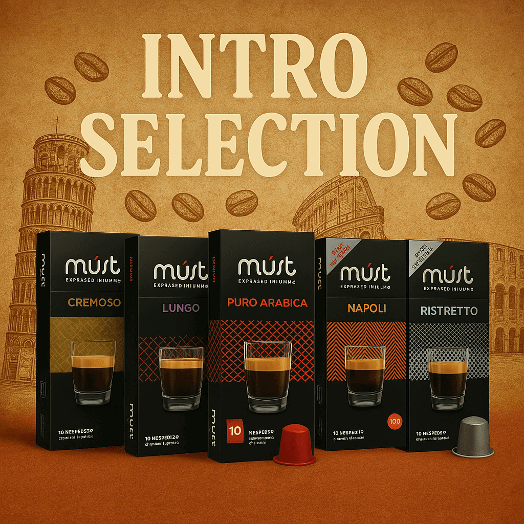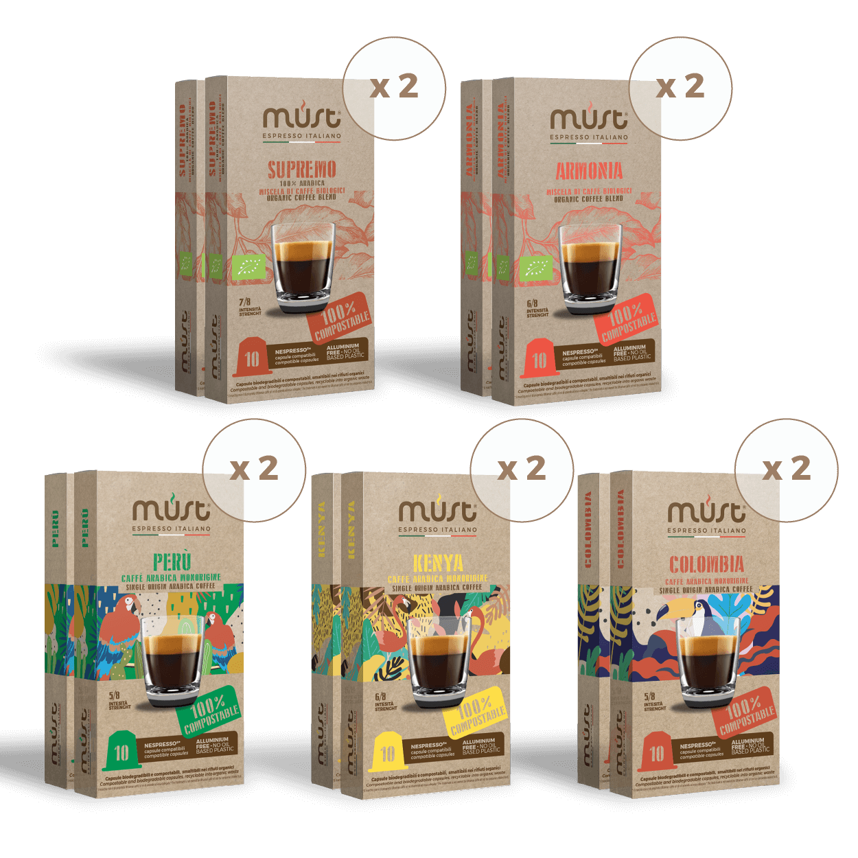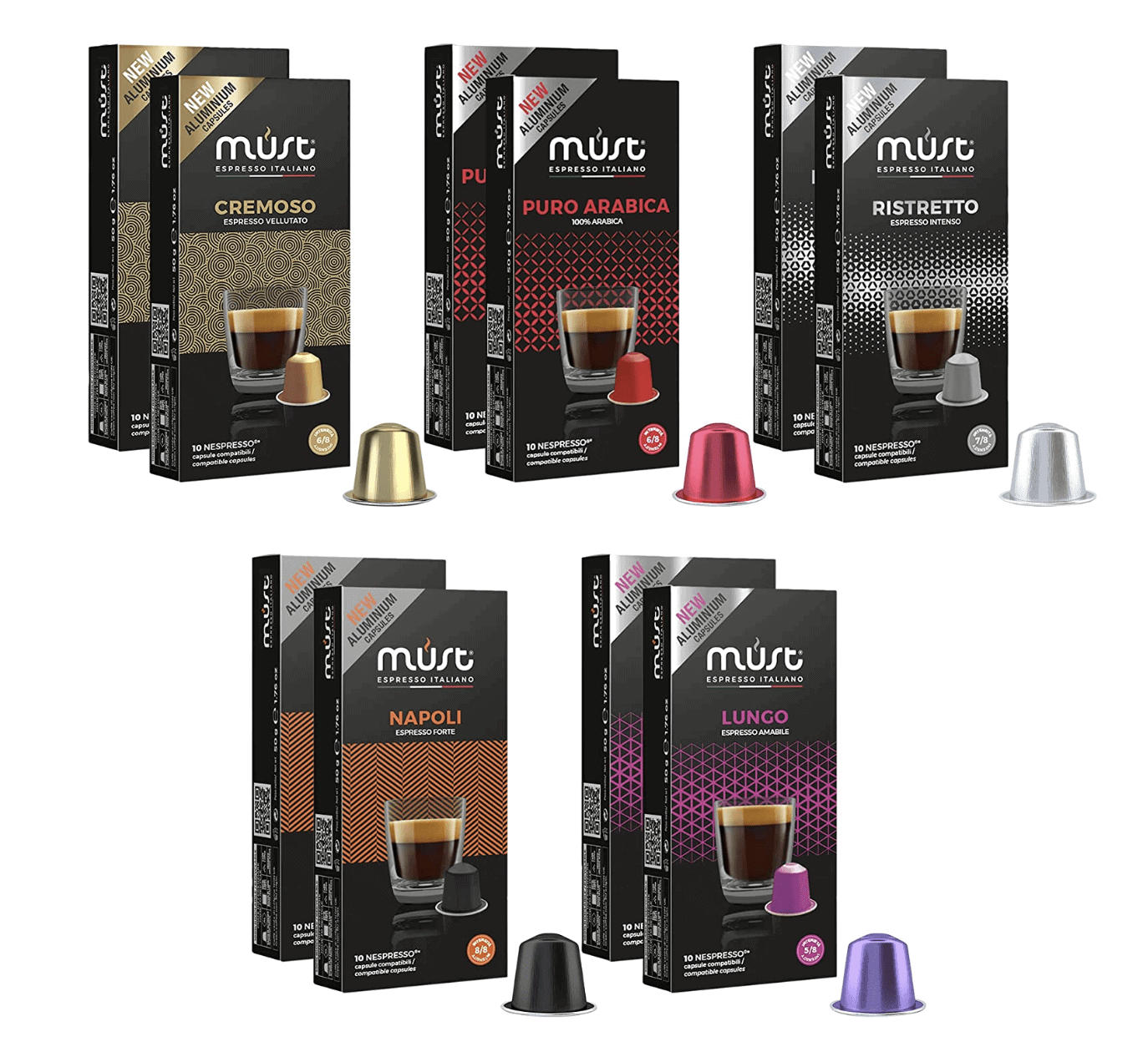 Mixed carton of 100 Pods (5 Blends) of Must Espresso Aluminium Nespresso Compatible Coffee Capsules. Includes 2 packs (20 capsules) (100 capsules in total)